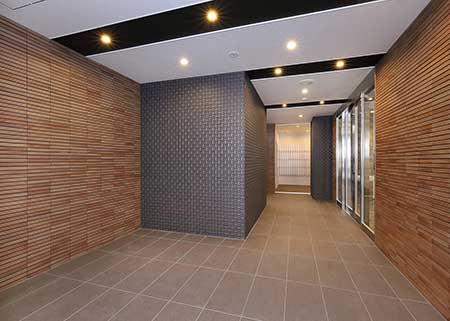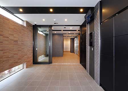 入館は専用カード・暗証番号タイプを採用、入居者は鍵を持たずに気軽に外出できるとともに、入退去が頻繁な学生マンションにとってメンテナンス費用の抑制にもなっています。