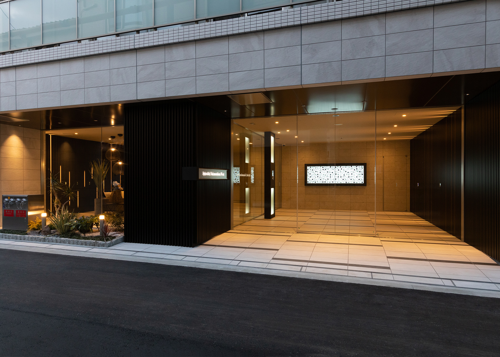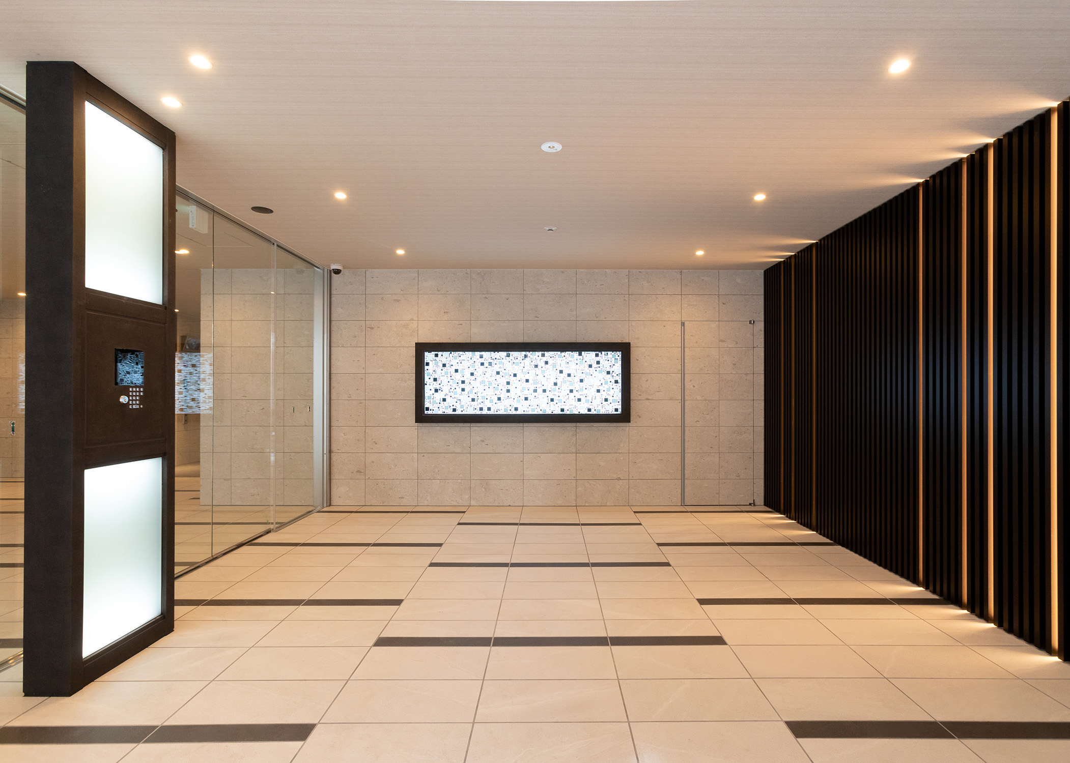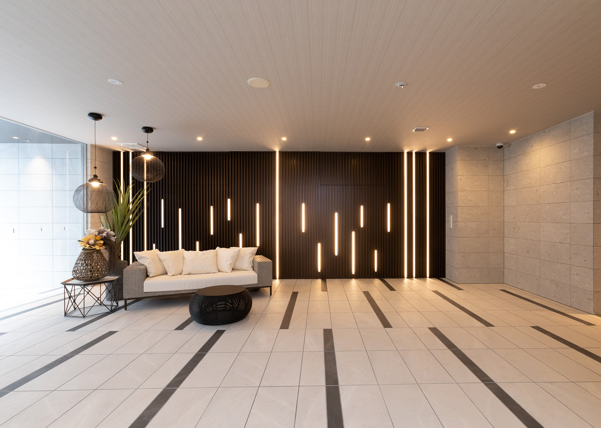 エントランスに入ると大理石調の床が広がり、ロビー空間にはリゾート風のソファと夕日のような柔らかな照明を配し、落ち着きと高級感を演出しました。