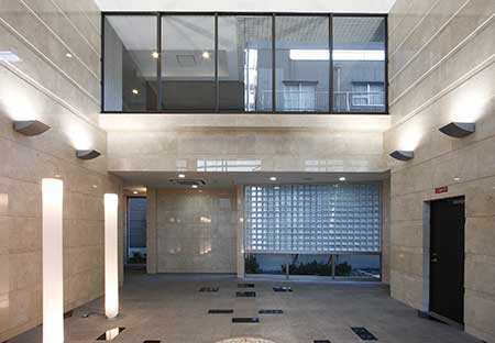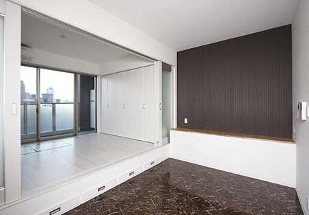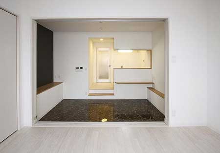 足が悪い母の為にバリアフリーにして。マンション側のエントランスにも、小さい時からあった石や植木を配置して、受け継がれてきたものを形に残して貰いました。