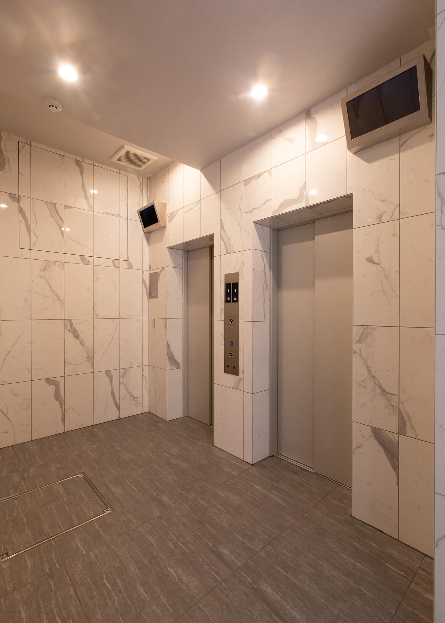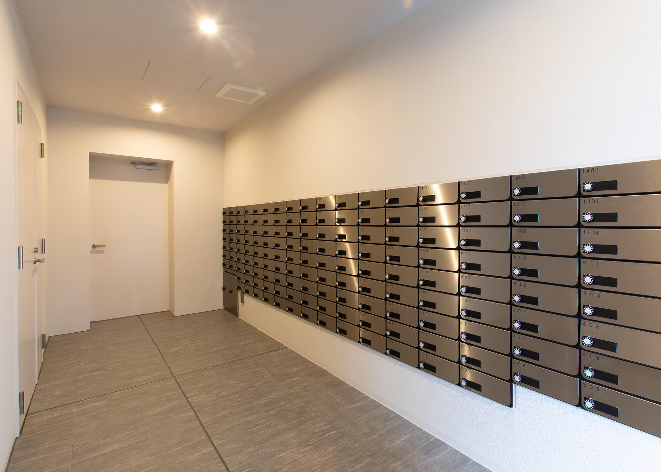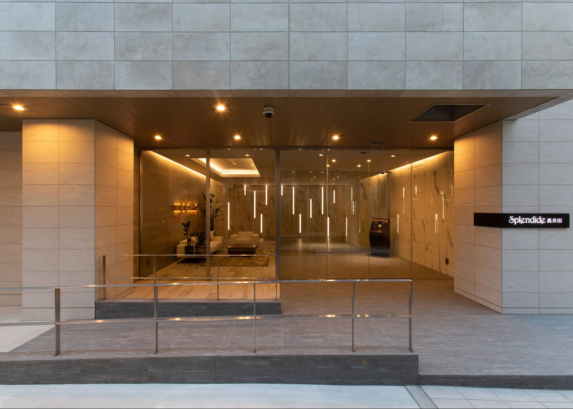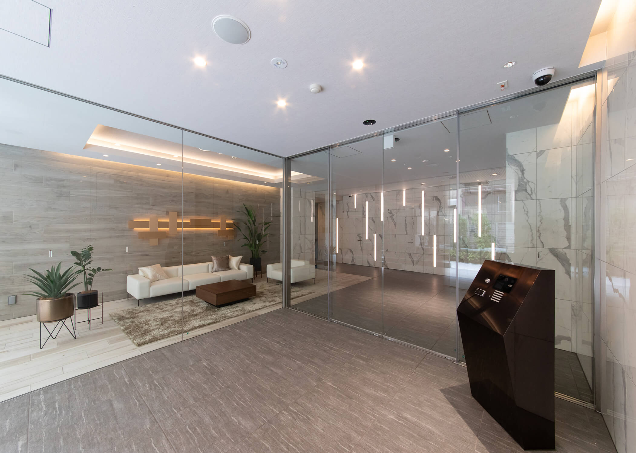 外観から室内、設備までハイグレードというコンセプトに沿い、上質なものを取り揃えています。外壁に白のタイルと黒のガラスでメリハリをつけたことで、陽光に照らされた姿が青空に映える外観がとても印象的です。エントランスにはオリジナルの壁面オブジェと本革ソファを設け、凛とした雰囲気を醸し出す高級ホテルをイメージできるような仕上がりです。入居者だけでなく、道行く人々の目を引きつける、重厚感漂う賃貸マンションです。