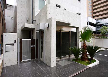 女性専用マンションとして企画された当物件。コンクリート打ち放し仕上げにも一工夫。通常は縦張りにする型枠を設計段階からパネルの割り付を検討し、あえて横張りにすることで、規模に比べて重厚感とデザイン性を上げることができました。バルコニーの給湯器を赤色に焼付塗装することで、女性らしさを演出。エレベーター無しの物件にも関わらず、高い入居率を維持されています。