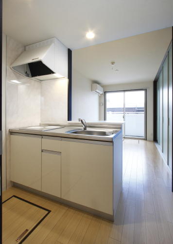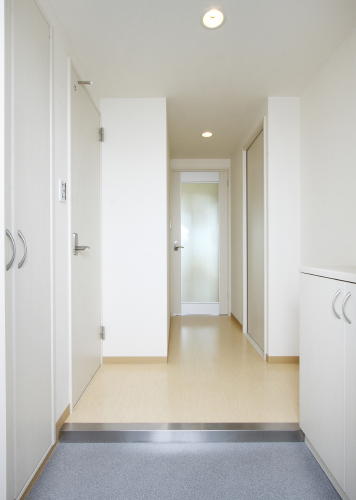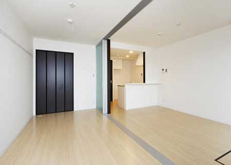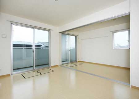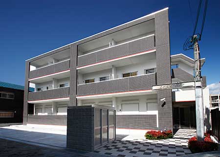 ルネス工法による3階建て賃貸マンションです。壁式ルネス工法で、部屋内には梁が無く空間がすっきりとしています。 部屋の隅には床下からコンセントが出せるような工夫もされていて、外壁やエントランスの赤いラインがアクセントになっています。 全住戸にルネス工法を採用してるので収納には困りません。