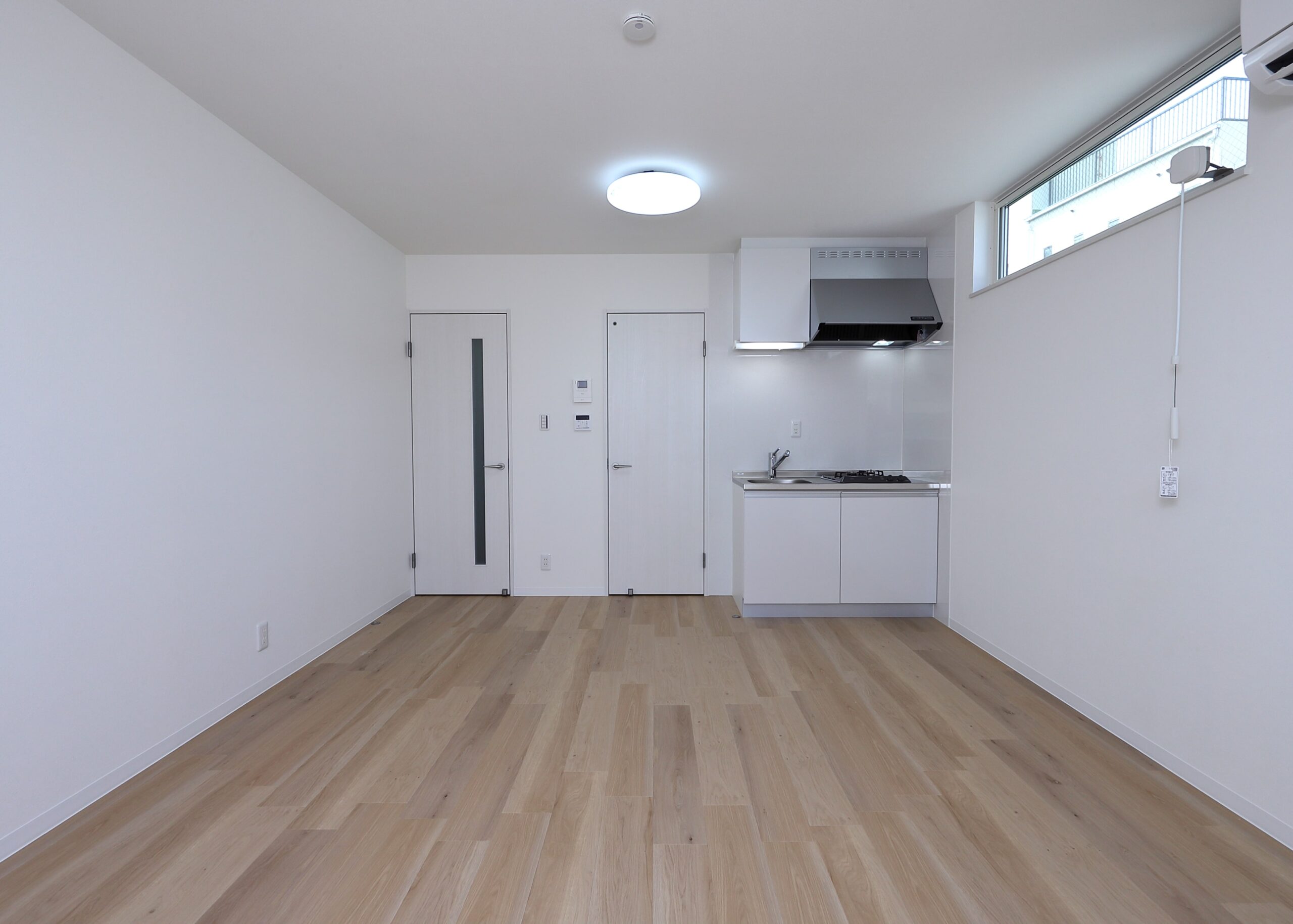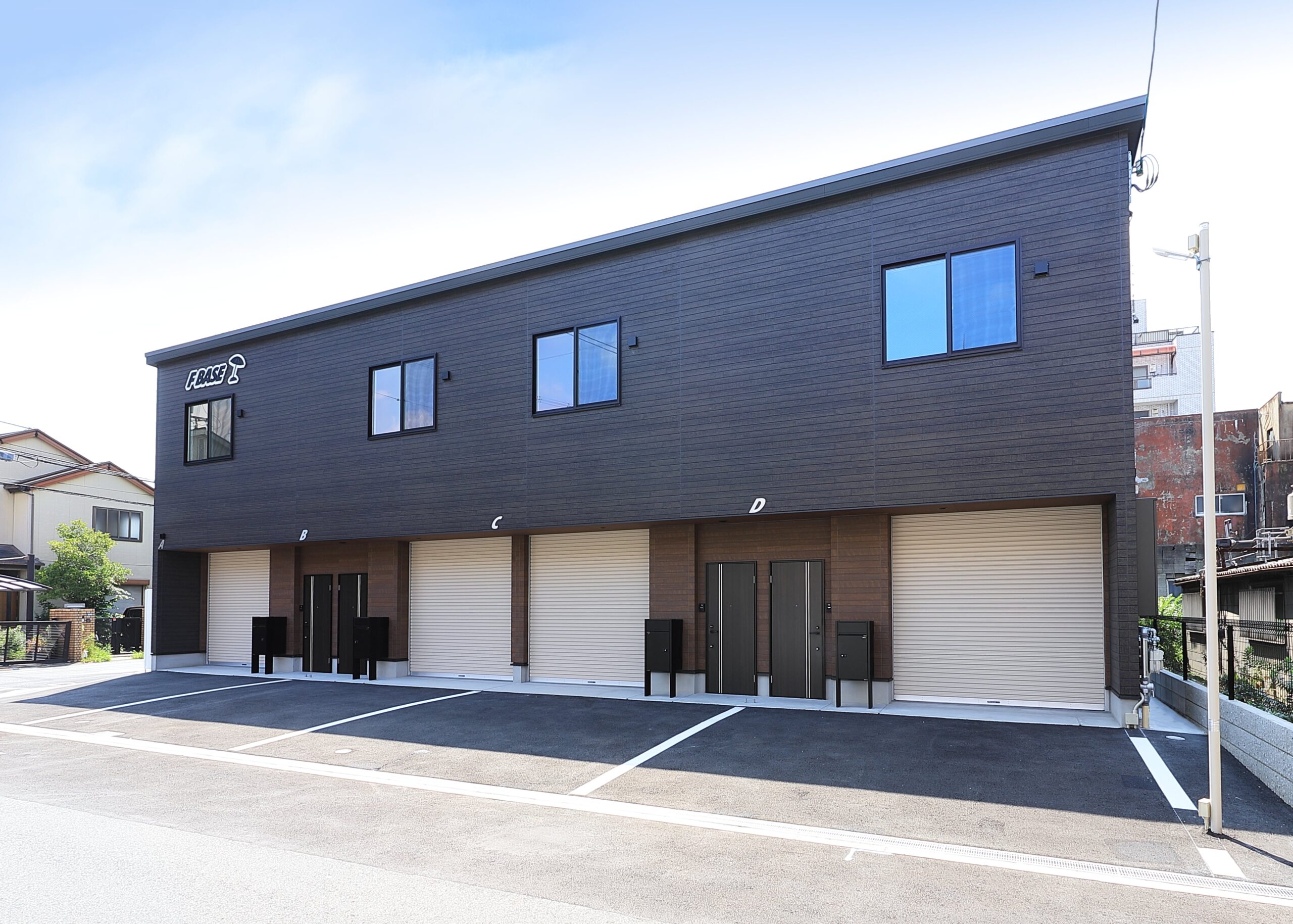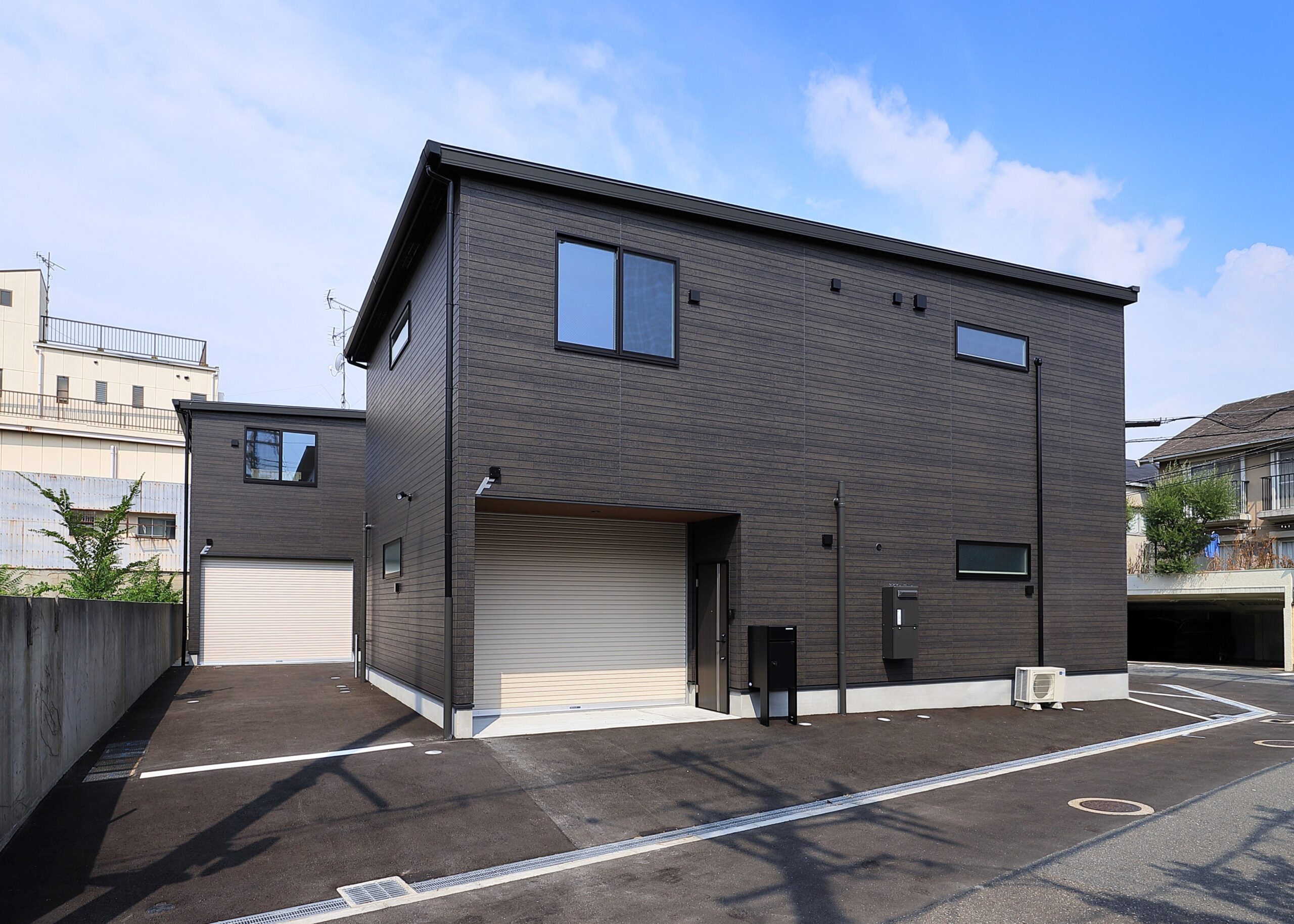大阪府東大阪市岸田堂南町に誕生した『F BASE』は、車やバイクを愛する方に人気の都市型ガレージハウスです。木造2階建・全6戸で、敷地面積422.44㎡、建築面積200.93㎡、延床面積377.52㎡。2025年3月から9月までの工期を経て竣工しました。各住戸には専用ガレージを備え、愛車を雨風や盗難から守りつつ、居住空間と趣味空間を一体化できる設計が特徴です。茶色と黒色の2色で仕上げたサイディングの外壁は、シンプルかつモダンな外観を演出し、住宅街に調和しながらも個性的な存在感を放ちます。前面には1台分の駐車スペースを確保しており、愛車を便利に駐められるゆとりの設計。さらに、今回初めてユニットバスを採用し、快適性とメンテナンス性を一段と高めました。