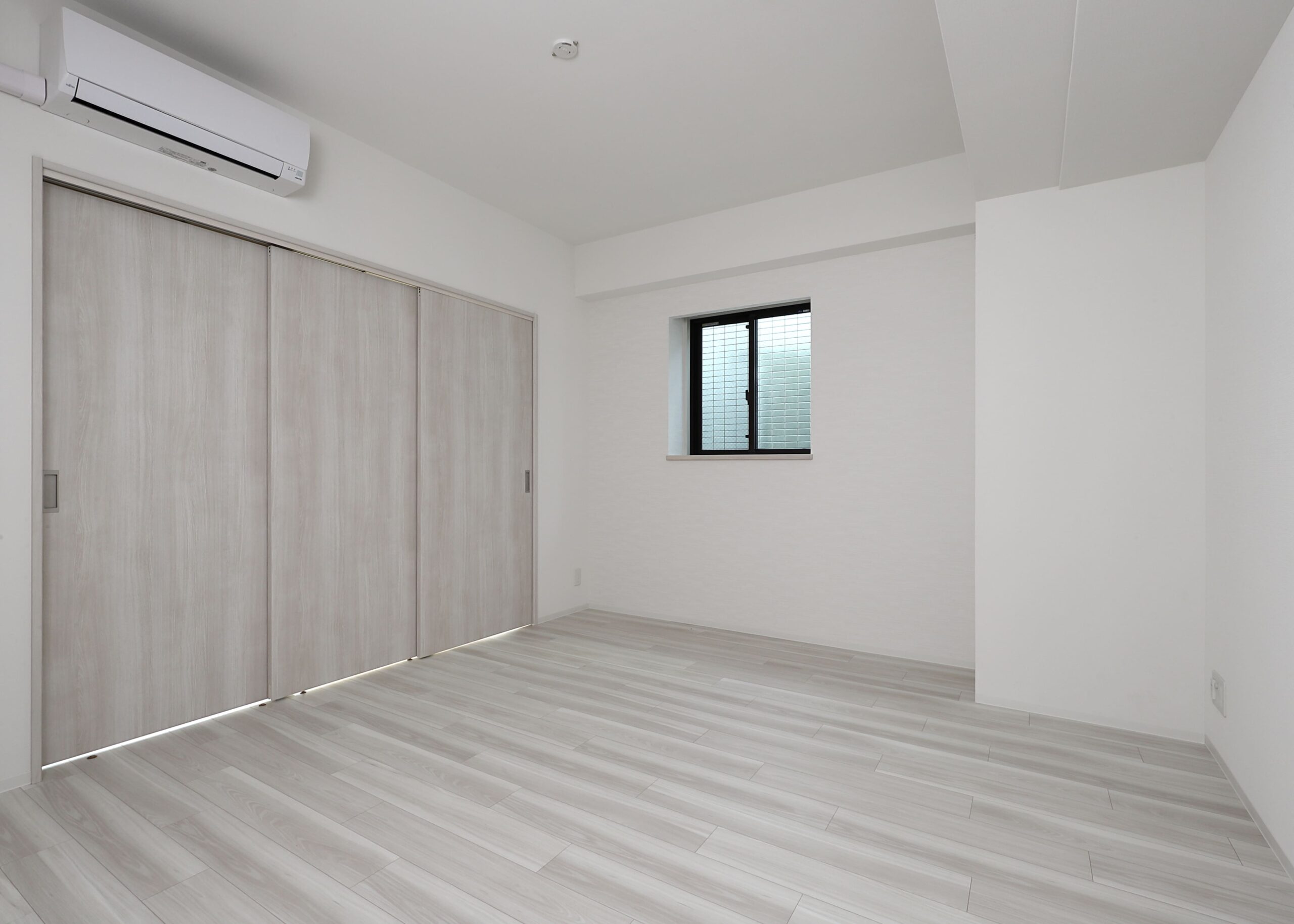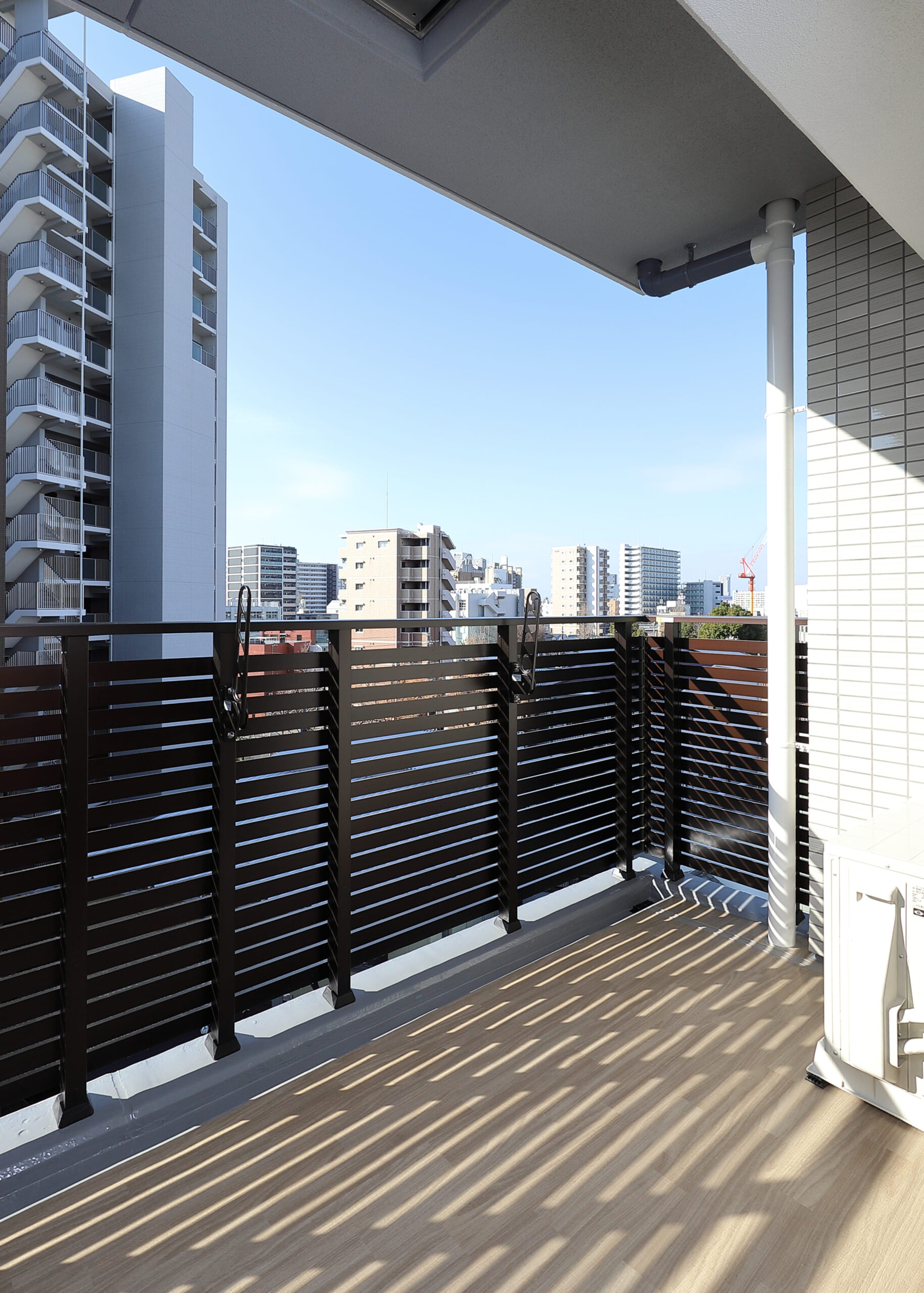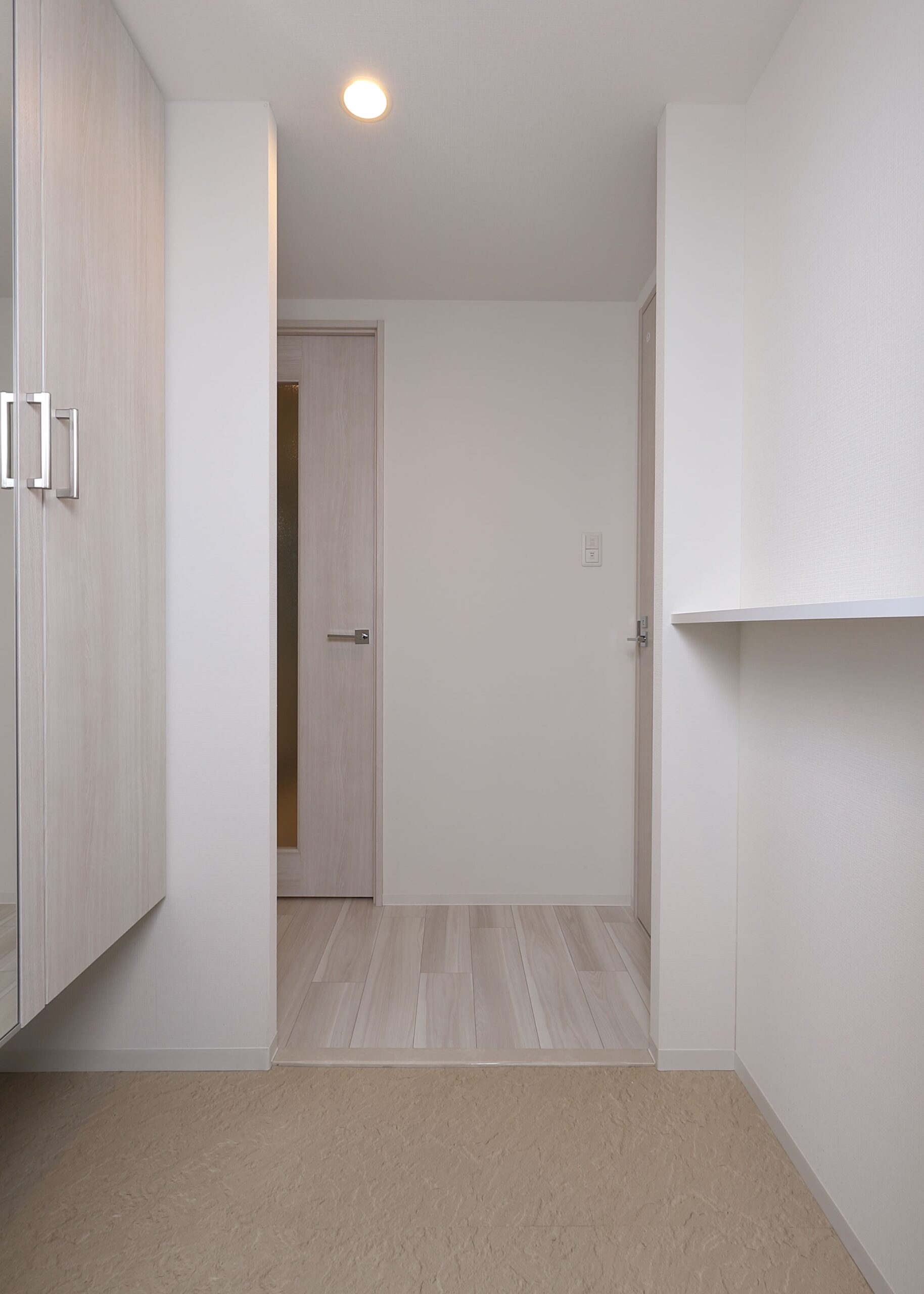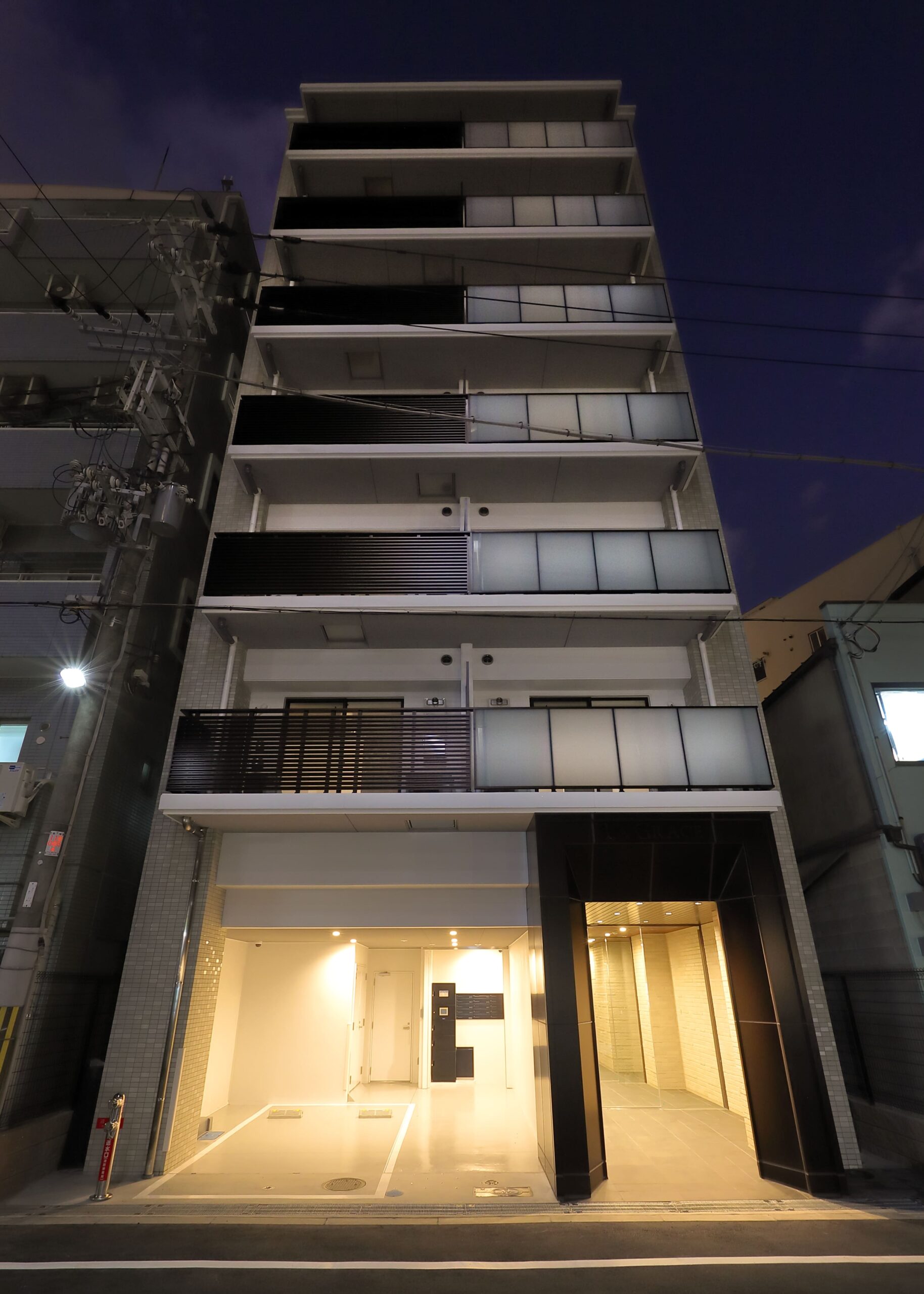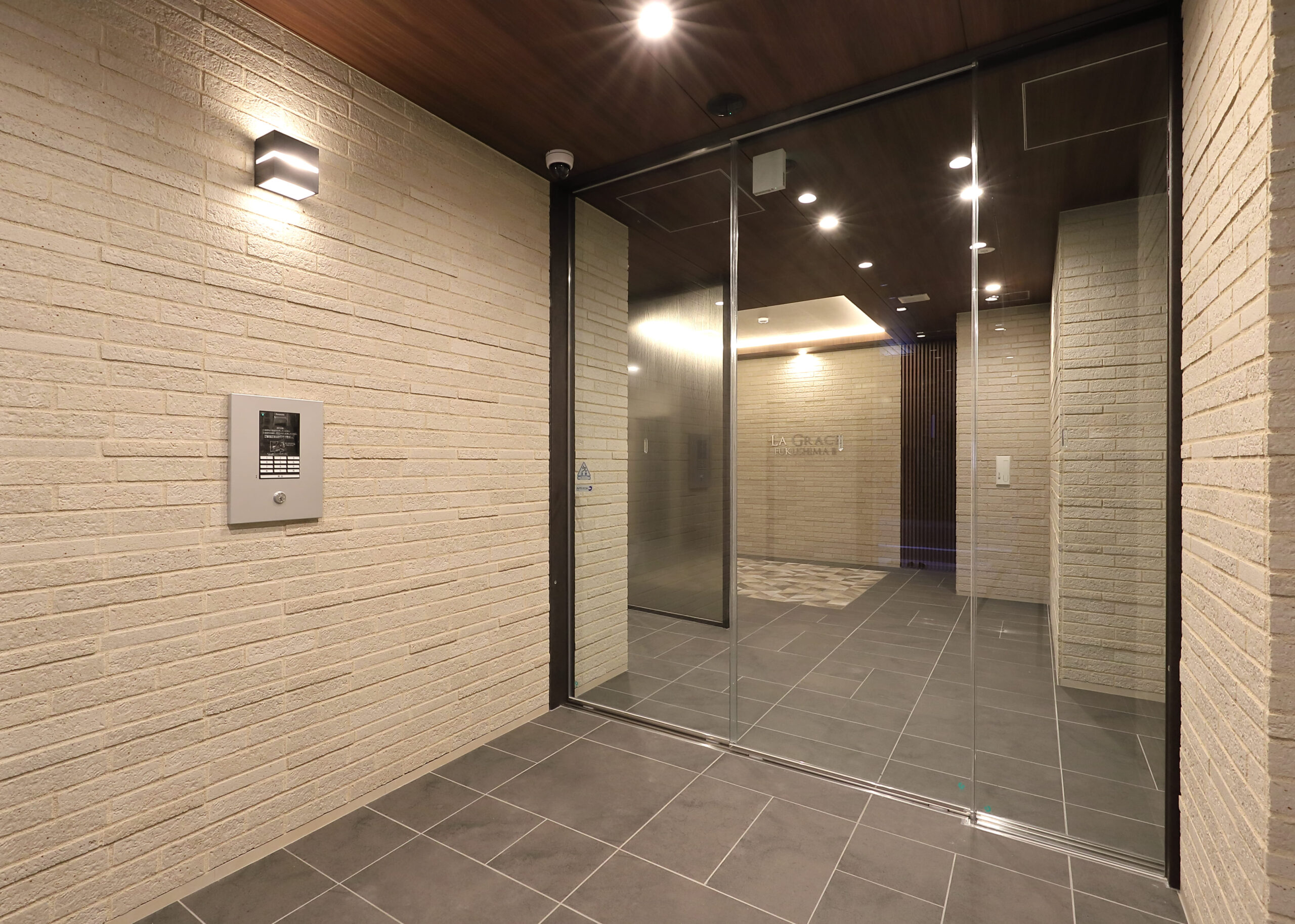 アプローチを通ってからのエントランスには、随所に木目調建材(ルーバーや天井材)を採用しており、そこに間接照明を当てております。入居者様が建物に帰ってきた際に少しでも心が和らぎ、安心してもらえる空間を演出したデザインに仕上げました。