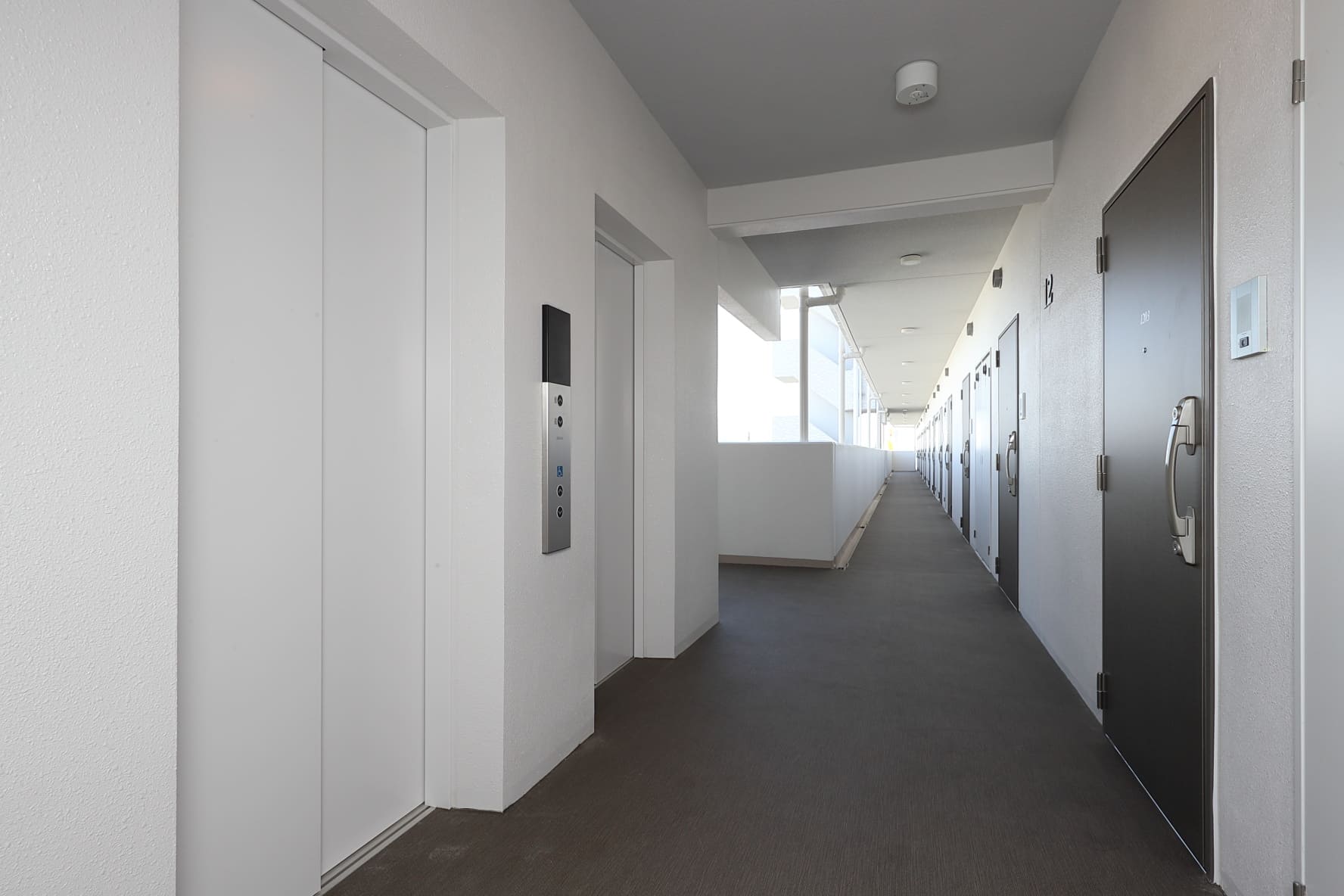 7階から上階はガラス手摺りを繰り返すことによりシンプルで落ち着いたデザインとしました。また、妻側には3層ごとにボーダーを入れることに単調なデザインとならないように工夫を施しております。