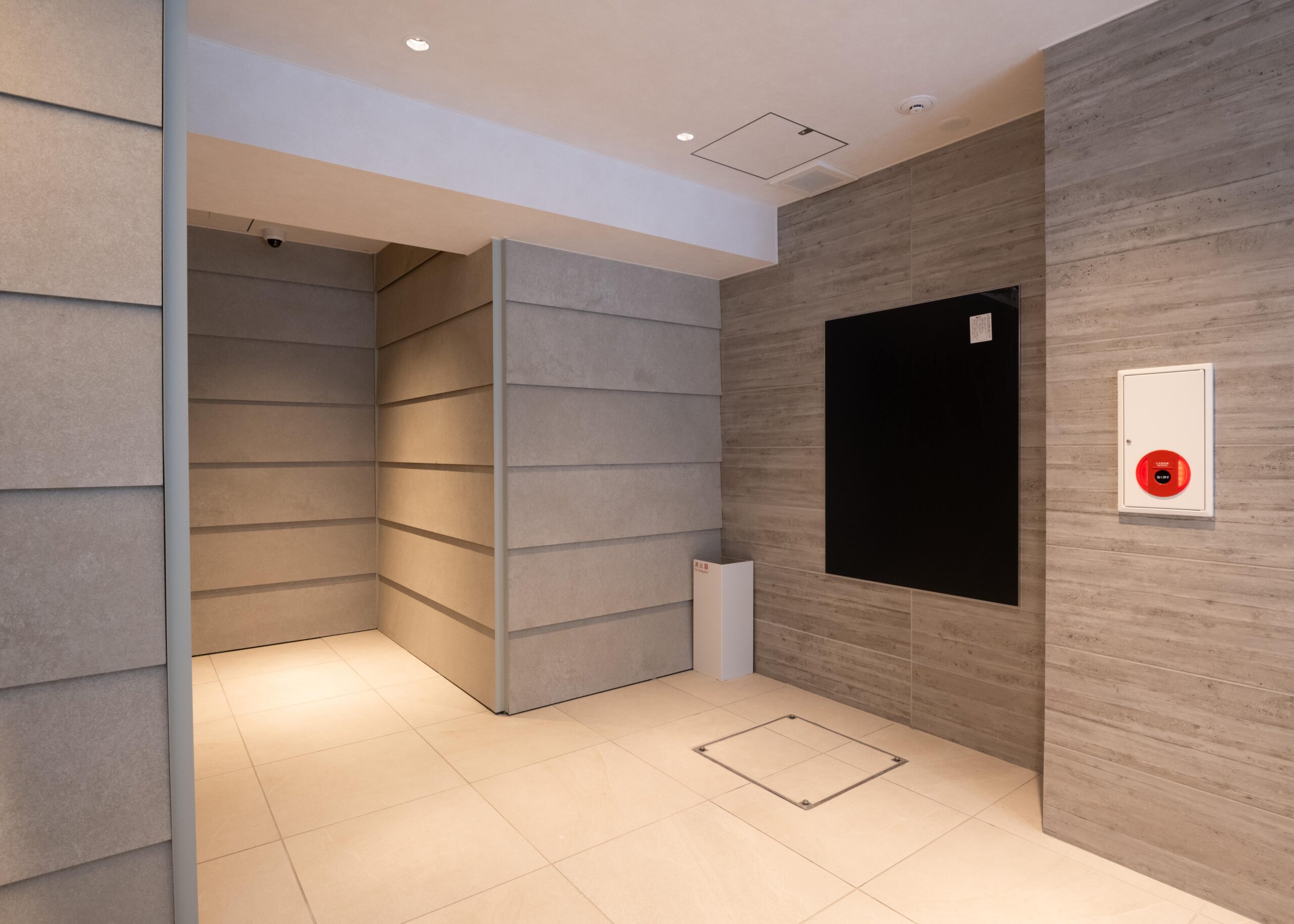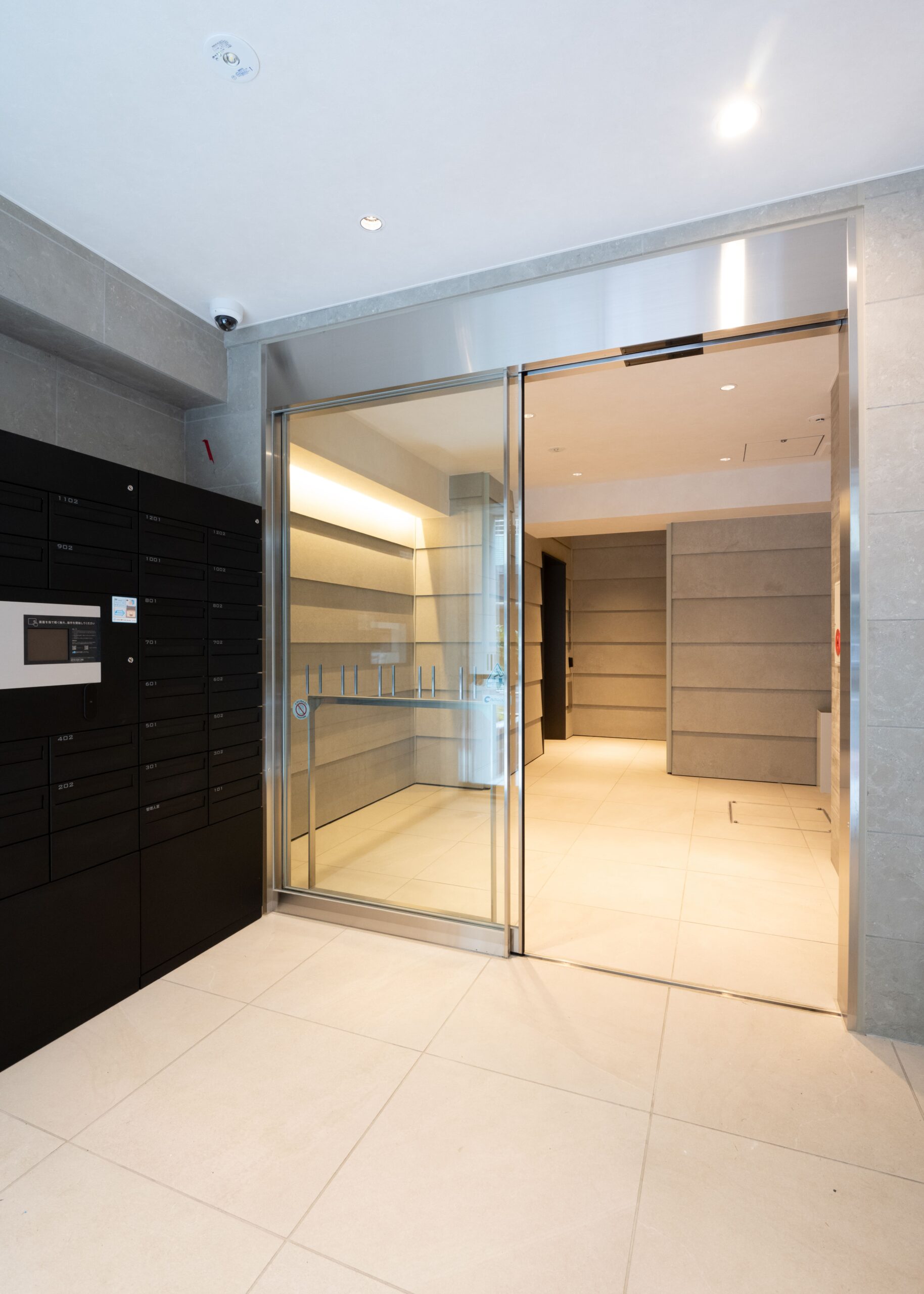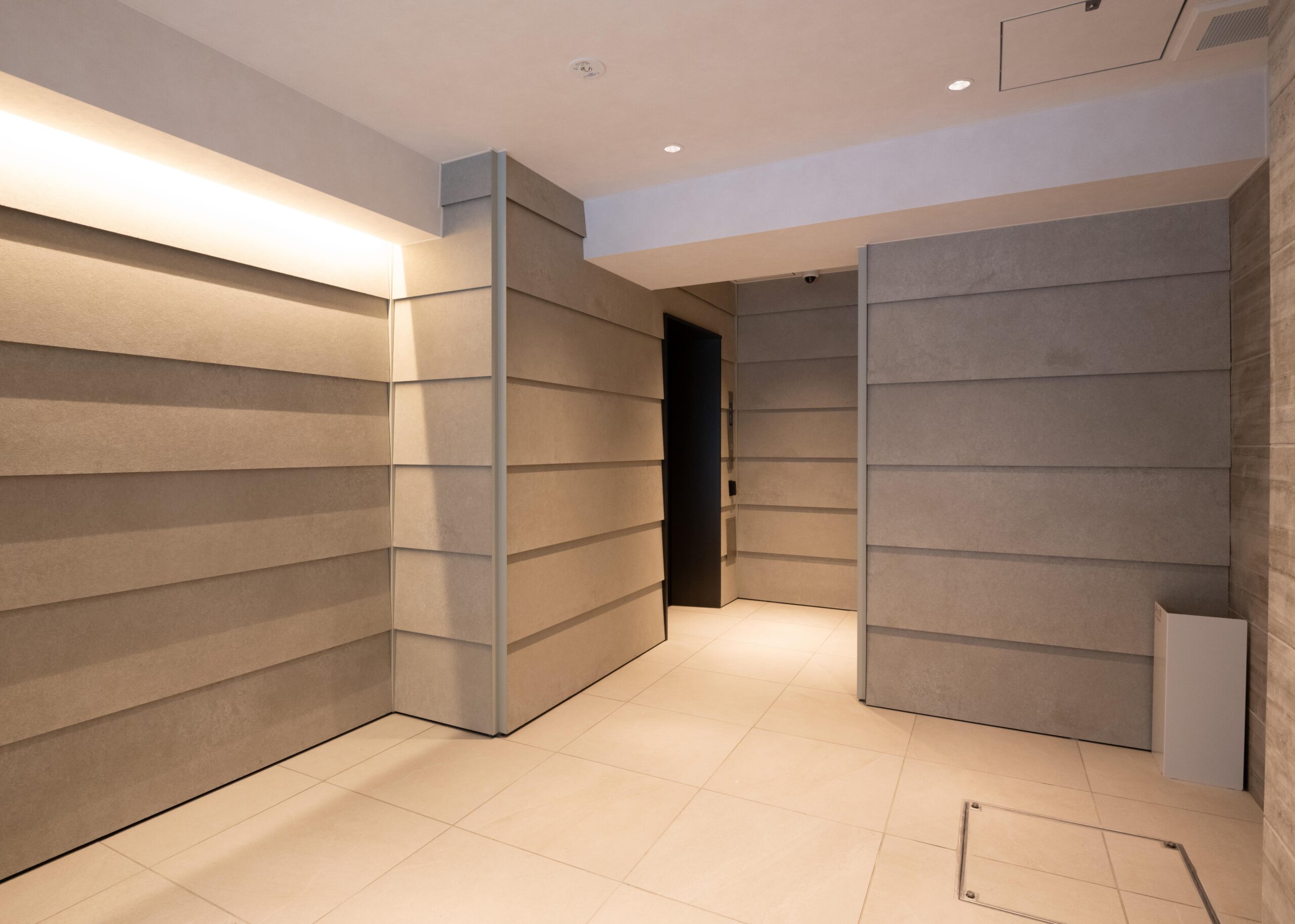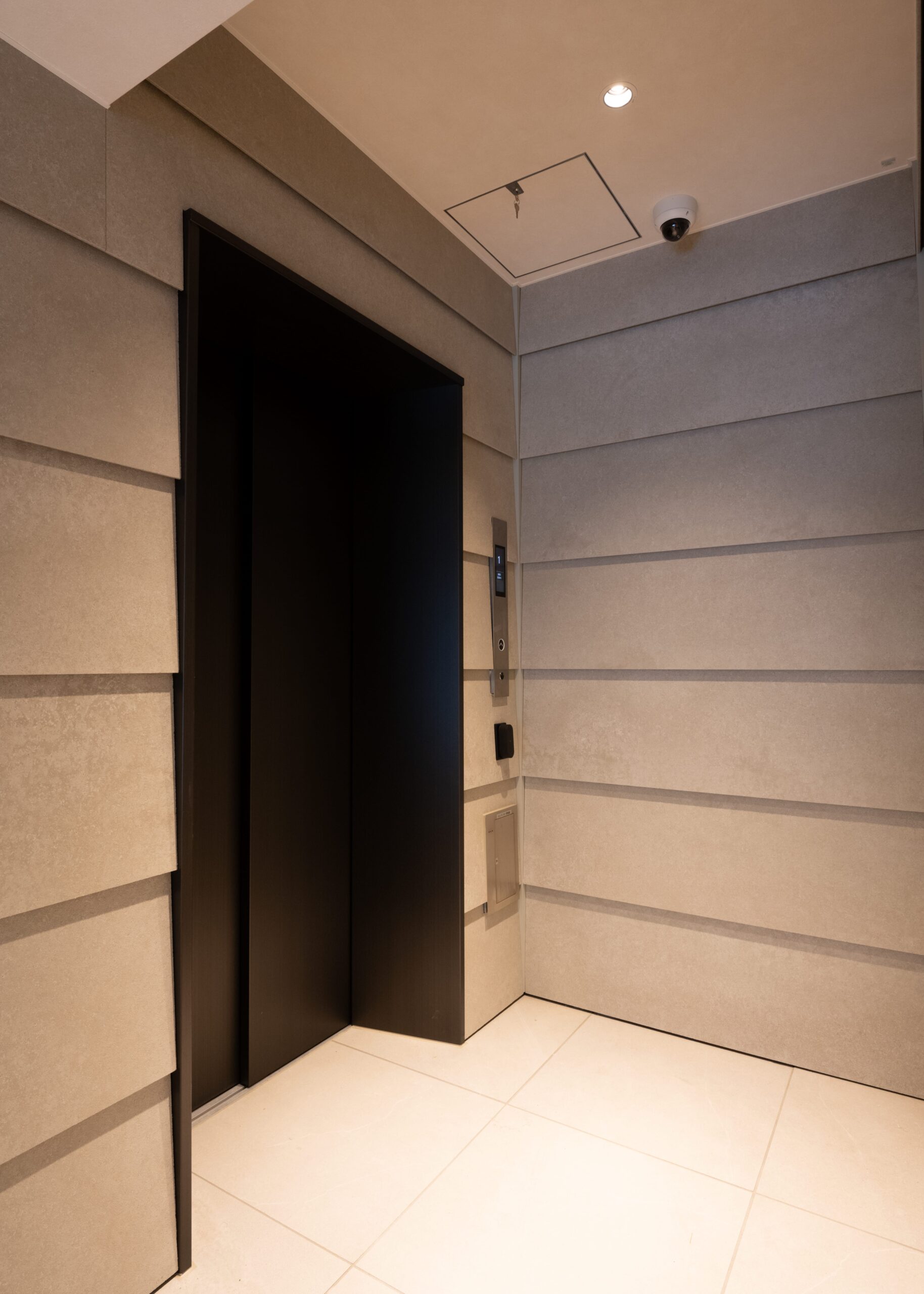 外観は、全体を明るめのベージュを基調とした石材タイルを用いながら、窓枠やベランダのガラス手摺りのブロンズガラスが濃い色をアクセントに効かせることで、スタイリッシュで高級感のある仕上がりになりました。エントランスやエントランスホールには淡いベージュ色の大型の石材を、色彩のグラデーションを活かしながら用いることで、高級感とともに安らぎの感じられる空間を演出しました。